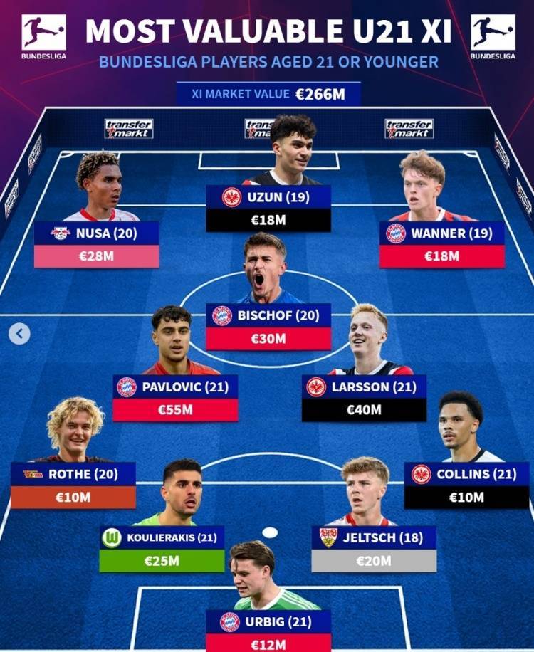 直播吧7月5日讯 《转会市场》统计了德甲U21球员身价最贵阵容,拜仁4将、法兰克福3人在列。