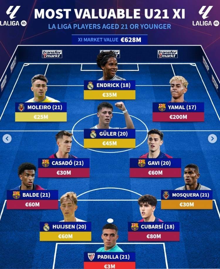 德转列西甲U21最贵阵:亚马尔2亿欧领衔巴萨5将,居勒尔&怀森在列